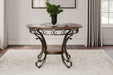 Incorporating a touch of European influence with its scrolled metal accents, this striking dining room table mixes various textural elements and rich earth tones in a way that’s so pleasing to the palette. We love how the circular inset glass on the dark finished tabletop serves up light and airy contrast. Whether you’re looking to entertain or simply make the best of your nest, do it with flair.